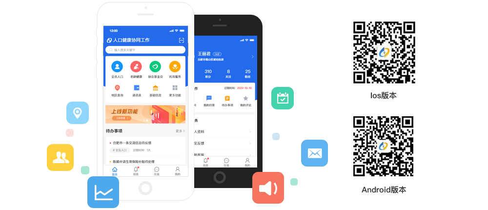 主要功能包含:掃碼登錄、身份認證、待辦事宜、信息交流、信息查詢、統計報表、信息維護、信息采集、數據分析、信息核查、知識庫、信息提醒等功能。