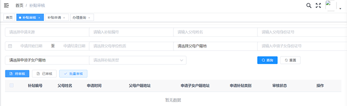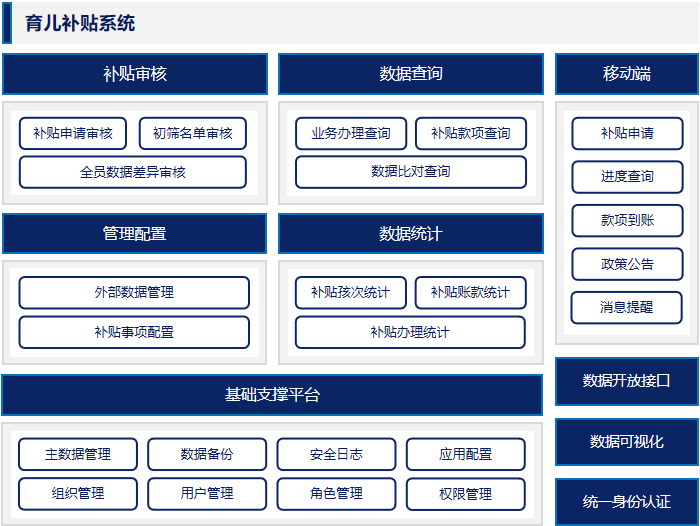 通過信息化服務于于二孩三孩補貼業務工作,達到提升育兒補貼申請、審批、打款等業務的辦事效率,有效降低時間、物力成本;保障生育補貼辦事流程各階段的信息完整、操作留痕、責任明確可追溯;建立明晰的制度規范,執行高效的生育補貼平臺,完善辦事機制。通過生育補貼便捷化申報及管理,做到“數據多跑路,群眾少跑路”,提高人民群眾幸福感,促進人口長期均衡發展。